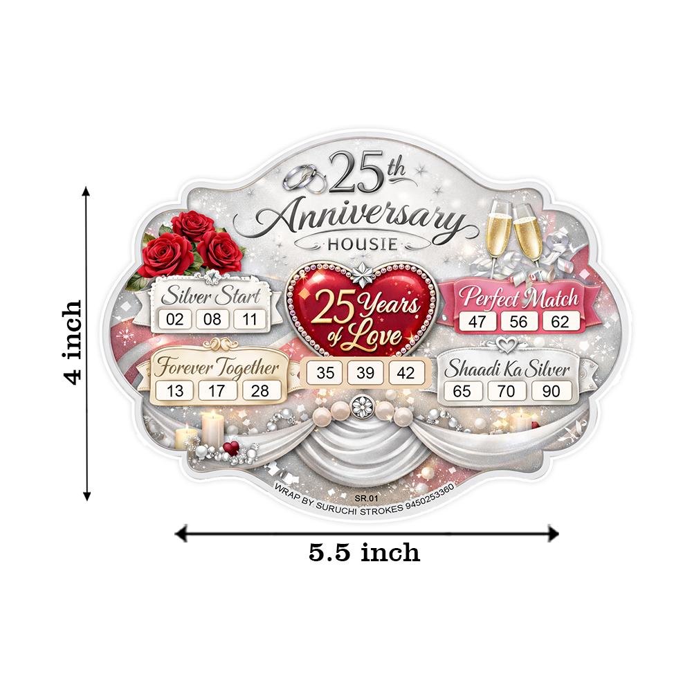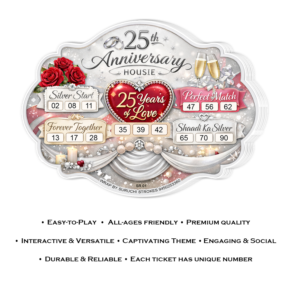 Wrap by Suruchi Strokes® presents 25th Wedding Anniversary Tambola Ticket. Celebrate 25 beautiful years of togetherness with our specially designed 25th Anniversary Tambola Tickets, inspired by the joy of a Silver Jubilee. This elegant tambola game adds excitement and a touch of nostalgia to your wedding party, making it perfect for couples celebrating their milestone with friends and family. This tambola ticket set perfectly captures the essence of a Silver Jubilee celebration. Whether it’s a grand anniversary party, kitty party, or an intimate family gathering, this tambola game ensures entertainment for all age groups. Designed for a joyful silver jubilee celebration, these tambola tickets beautifully capture the love of a bride & groom, the bond of husband and wife, and the happiness of marriage moments. This 25th anniversary tambola tickets come with premium silver-themed elements, romantic motifs, and celebration-inspired graphics and unique dividend patterns like Together Forever, Silver Start, Shaadi ka silver and perfect match making the game more engaging and personalized. The 25th anniversary tambola (housie/bingo) game is ideal for wedding anniversaries, couple celebrations, family get-togethers, and party events. Make your celebration unforgettable with laughter, bonding, and fun-filled tambola moments.