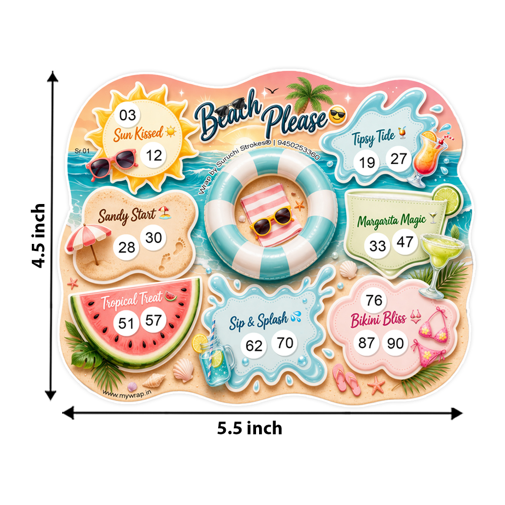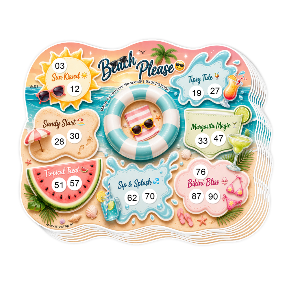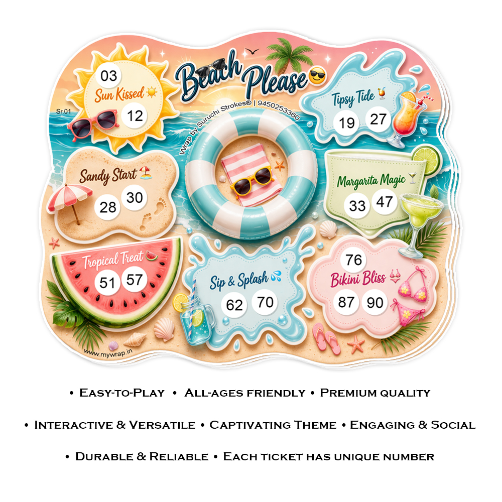 Wrap by Suruchi Strokes® presents Beach theme tambola ticket. Bring the ultimate summer vibe to your celebrations with our Beach Theme Tambola Tickets – a fun-filled summer beach tambola ticket game designed to make every gathering lively and memorable. Perfect for pool parties, kitty parties, beach bingo nights, and housie games, this tambola set captures the essence of a tropical escape with vibrant beach-inspired designs. Whether you’re hosting a kid’s birthday party, family get-together, or friends’ holiday celebration, these tambola tickets add excitement and entertainment to every moment. Beach tambola is inspired by sunny destinations like Goa and Hawaiian beaches, this beach tambola game is ideal for summer vacations, poolside fun, and festive gatherings. Enjoy a refreshing twist on the classic tambola housie game as you play with your loved ones, creating laughter and unforgettable memories. Lightweight, easy to carry, and visually attractive, these beach theme tambola tickets are perfect for both indoor and outdoor use during holidays and summer vacations. Make your next celebration more exciting with this summer beach tambola ticket game, a must-have for anyone who loves fun, games, and beach vibes!