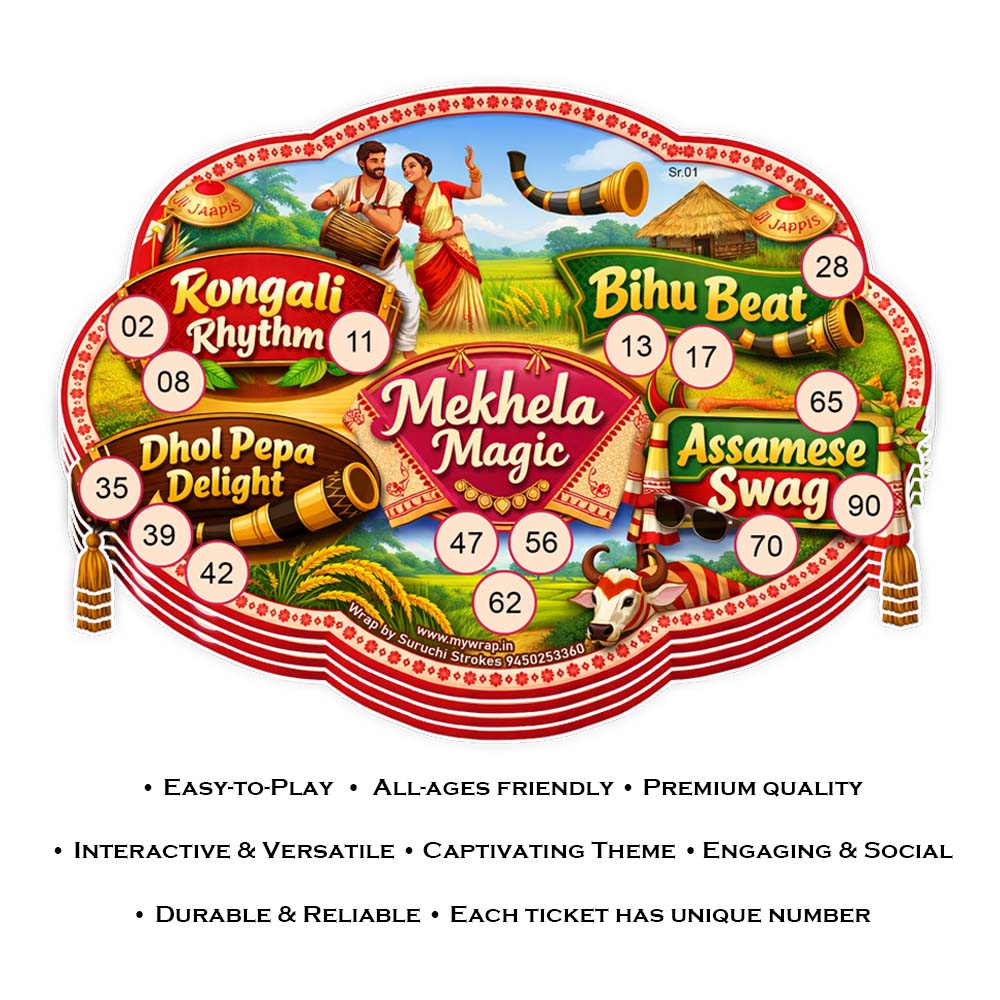 Wrap by Suruchi Strokes®, Presents Bihu Theme Tambola Ticket. Celebrate the vibrant spirit of the Assamese harvest festival with Bihu Theme Tambola Tickets, a fun and cultural housie game designed to bring joy, laughter, and festive excitement to your celebrations. Inspired by the colourful traditions of Bihu, these tambola tickets beautifully reflect the essence of Assamese culture, music, dance, and harvest celebrations. Perfect for kitty parties, cultural gatherings, family get-togethers, and festive celebrations, this unique Bihu-themed game adds a creative twist to your party entertainment. Bihu is one of the most important cultural festivals of Assam and is closely connected with agriculture and seasonal changes. It is celebrated as Rongali (Bohag) Bihu, symbolizing joy, harvest, gratitude, and prosperity. The Bihu Theme Tambola Game captures this festive energy through creatively designed tickets featuring elements like traditional Assamese culture, festive colours, harvest vibes, and joyful celebrations. This tambola ticket set is ideal for hosting a Bihu festival party, Assamese cultural events, kitty parties, and festive gatherings where friends and family can enjoy playing together. The game encourages bonding, laughter, and friendly competition while celebrating the spirit of Assamese heritage.