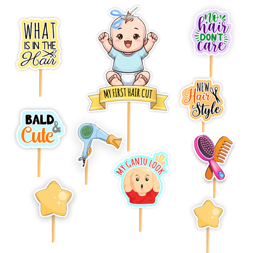 - A set of 10 cake toppers (1 Big Topper and 9 Small Toppers) for baby boy first haircut ceremony.