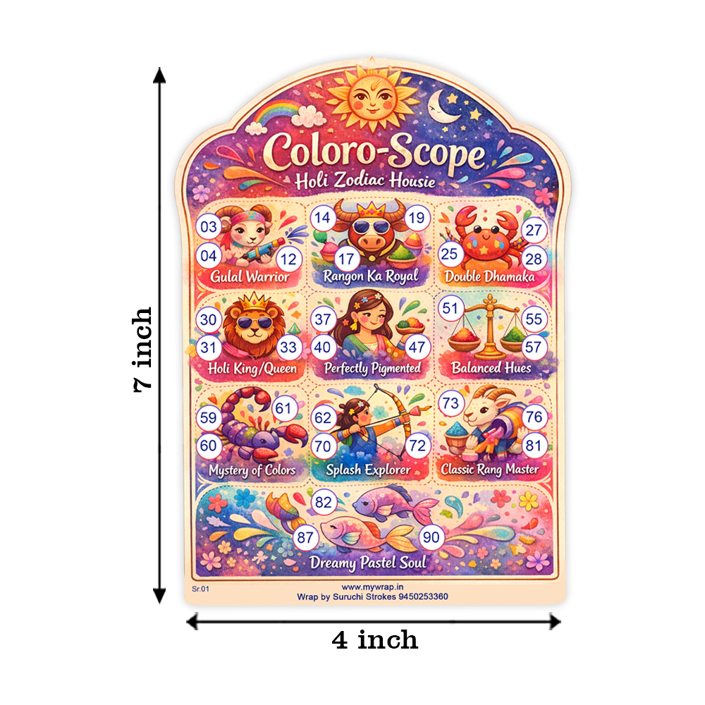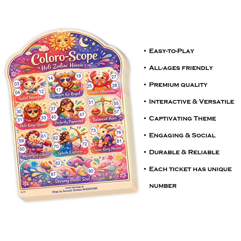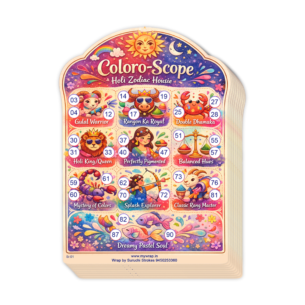 Wrap by Suruchi Strokes® Launch Holi tambola ticket. Celebrate Holi the Festival of Colours, with a unique and vibrant twist that blends tradition, astrology, and timeless fun! The Holi Zodiac Theme Tambola is an exciting game designed to bring together the joy of with the mystical charm of the zodiac (Rashis). This themed version elevates your Holi party or kitty event with color, personality, and cosmic flair.