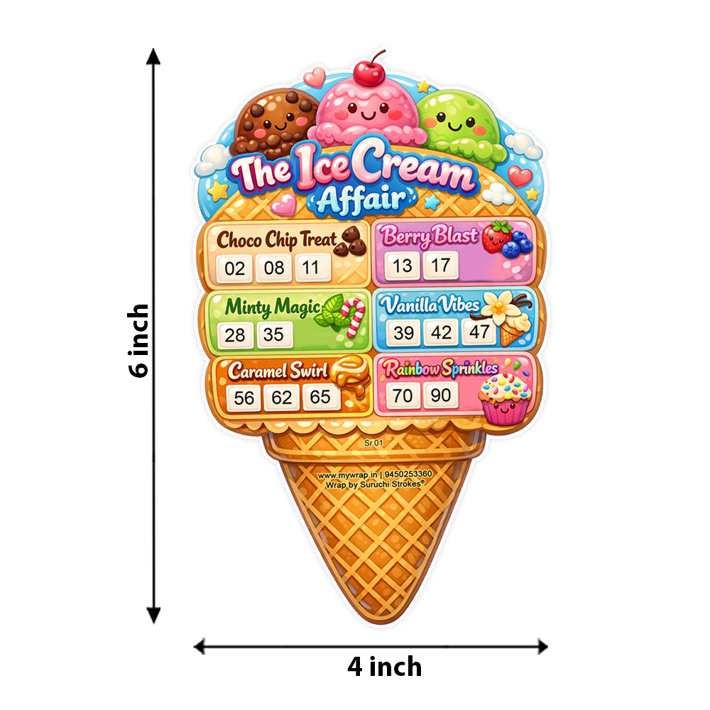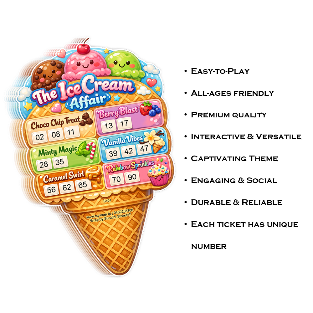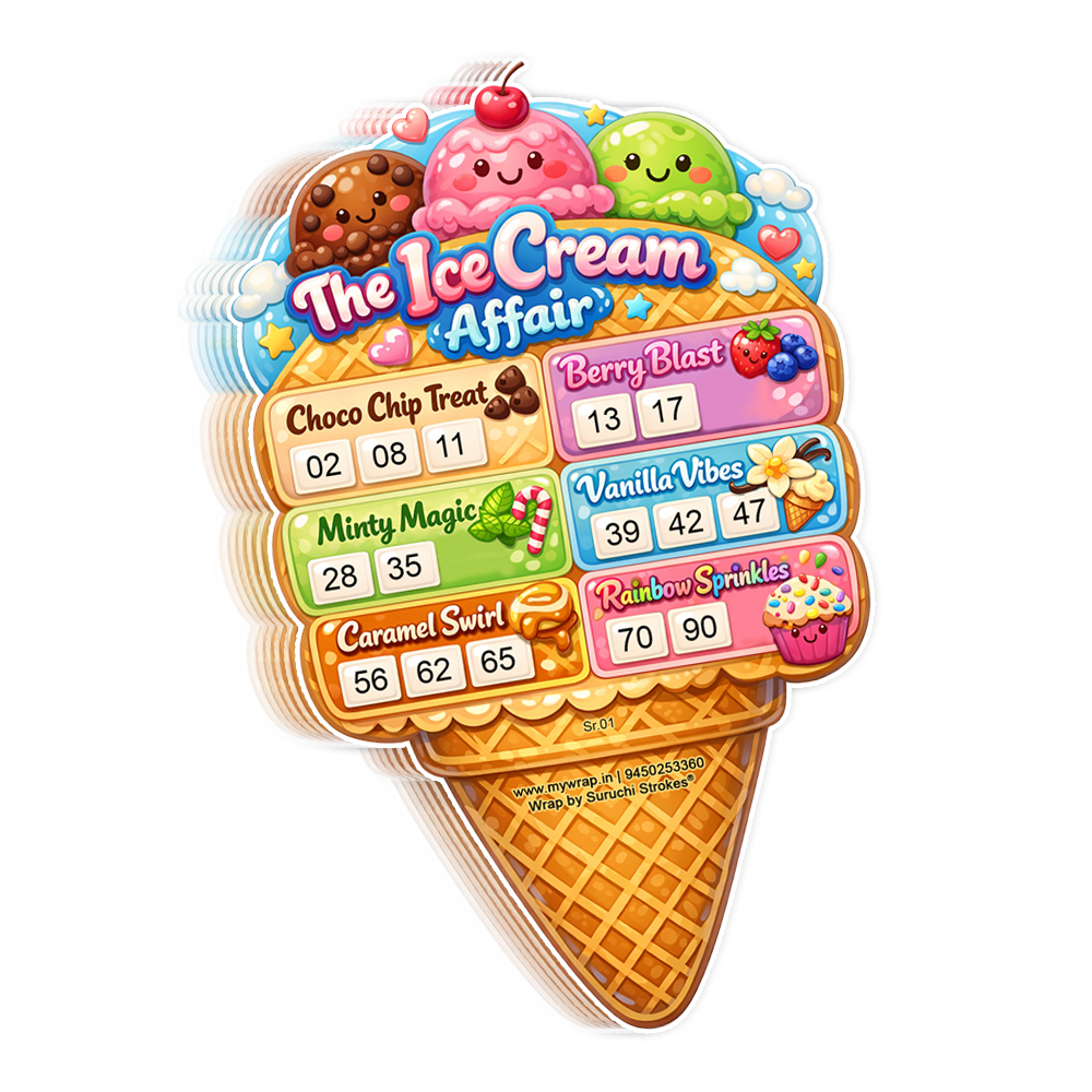 Wrap by Suruchi Strokes® Launch Ice cream Tambola Ticket. This Ice Cream Tambola Game – a perfect blend of classic housie entertainment and refreshing summer vibes. Designed with colourful ice cream graphics, engaging gameplay and with scoops of fun and entertainment, this tambola set turns every gathering into a lively celebration. Whether you’re hosting ice cream theme carnival party, birthday party, kitty, summer holidays get-together, or family game night, this ice cream-themed housie game adds a unique twist for all ages. A perfect summer pool activity game that brings refreshing beachy vibes and keeps guests entertained during holidays celebration. The ice cream tambola game adds a hawaiian tropical atmosphere to children summer party with side treats. This ice cream tambola tickets are great for both indoor and outdoor tambola parties. Ideal for birthday parties to create an effect of ice cream candy land which kids will enjoy. The easy-to-read numbers make this housie game suitable for all age groups, ensuring smooth gameplay and endless fun for kids, friends, and family members. Turn your event into a fun-filled celebration with this Ice Cream Tambola Game. It’s not just a tambola game—it’s an experience that brings people together with laughter, excitement, and a sweet twist of creativity.