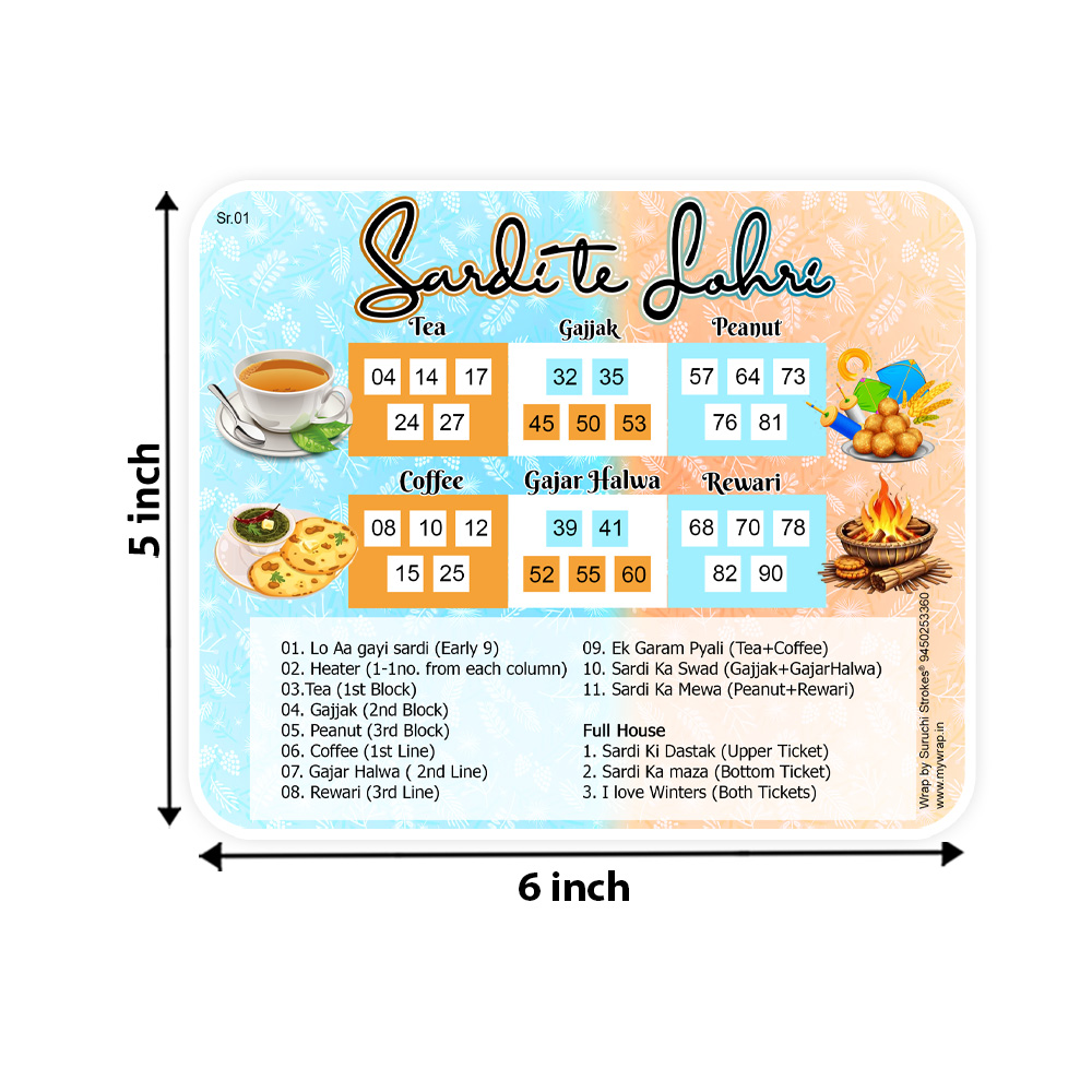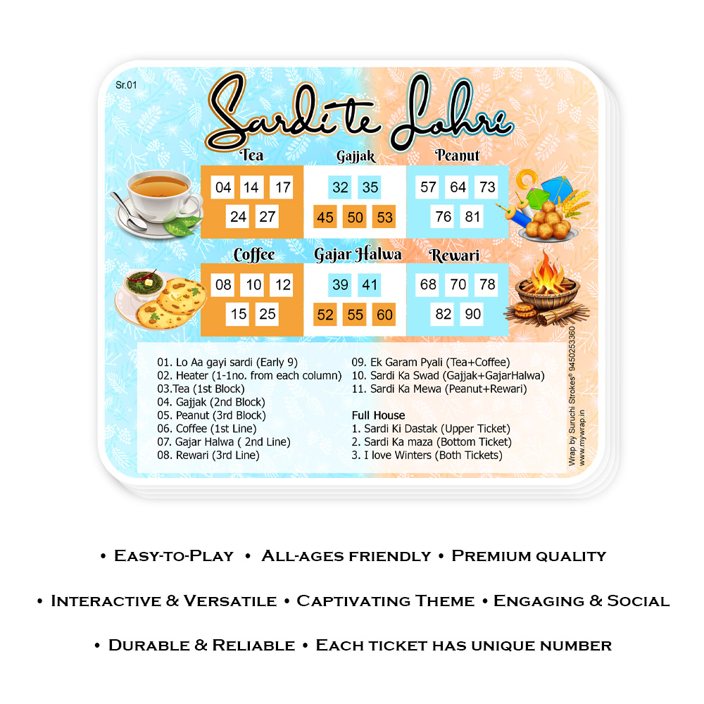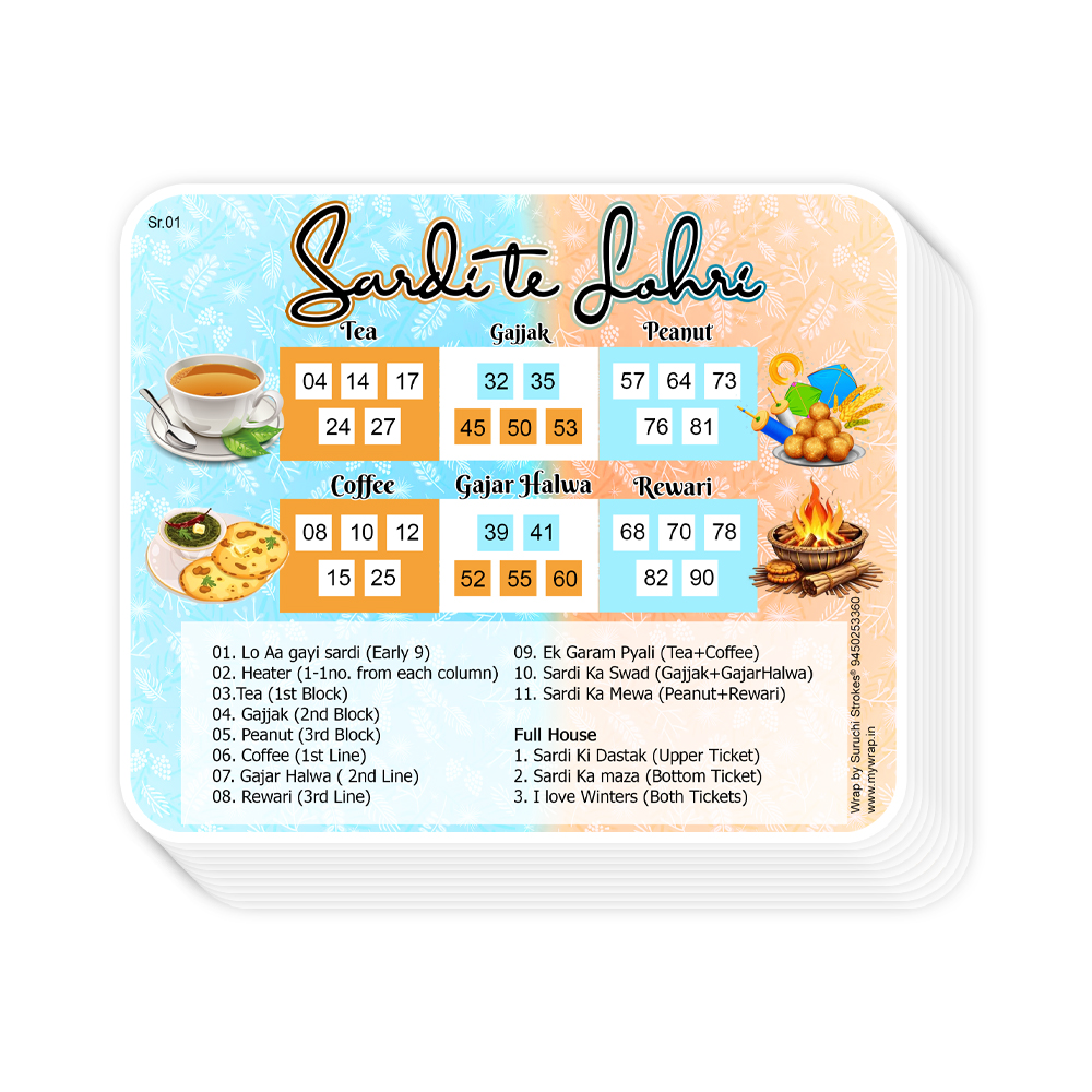 Wrap by Suruchi Strokes® Launch Lohri Theme Tambola Ticket. Bring the warmth and joy of Lohri into your celebrations with this specially designed Sardi te Lohri theme Tambola Game — a festive, fun, and culturally rich game perfect for family gatherings, community events, or party nights. Inspired by the traditional Lohri bonfire, this game combines the spirit of harvest festival with the interactive excitement of tambola (housie). Lohri is one of Punjab’s most cherished festivals — marking the end of winter, the onset of longer days, and the gratitude of farmers for the Rabi harvest. On Lohri night, people gather around blazing bonfires, sing folk songs, perform Bhangra or Giddha, and offer traditional items like sesame (til), popcorn, jaggery, and peanuts to the fire as a symbol of thanks and purification. This tambola game captures that very essence — offering a fun, social way for people to come together, reminisce, dance, and celebrate.