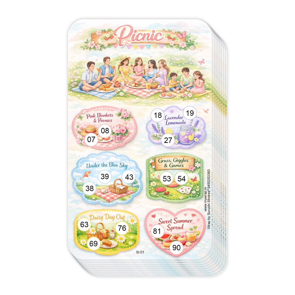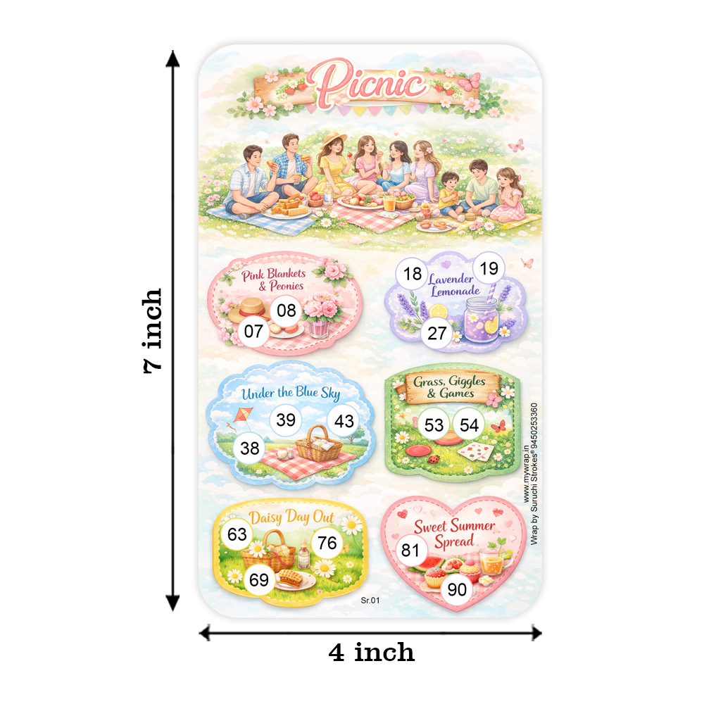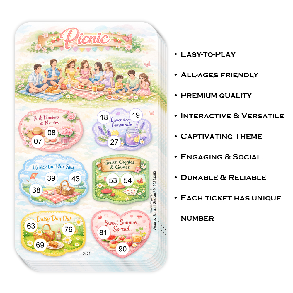 Wrap by Suruchi Strokes® Summer Collection Picnic Theme Tambola Ticket. Enjoy tambola in a new way with a unique picnic theme. Perfect entertainment for picnic parties, kitty parties, family gatherings and birthday celebrations. Great party game for lady’s kitty, office parties, house parties, outdoor picnic events and family game nights. Works like regular tambola/housie – the host calls numbers and players mark them on their tickets to win prizes. Attractive picnic themed cards with fun elements like picnic basket, food, games and outdoor vibes to make the party more exciting. Fun game for adults, kids and families – ideal for gatherings, festivals and celebrations. Turn your picnic gatherings into unforgettable moments with our Picnic Theme Tambola Tickets. Designed especially for party entertainment, these tickets add excitement, laughter, and friendly competition to your picnic celebrations. Make the game more thrilling by adding prize rounds like Early Five Top Line Middle Line Bottom Lin Full House Make your picnic parties more exciting with these Picnic Theme Tambola Tickets. this tambola game will bring laughter and entertainment to your event. Enjoy memorable moments with friends and family while playing this classic party game.