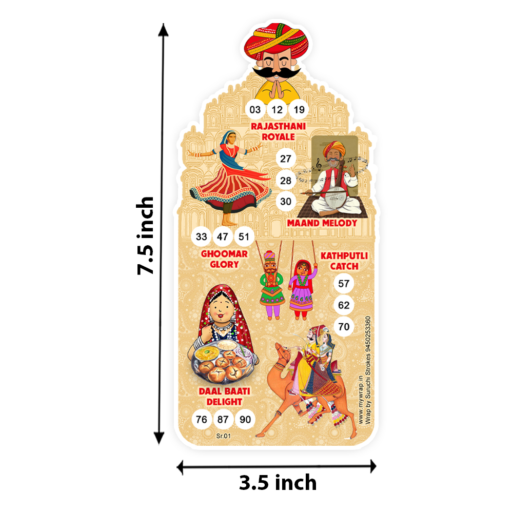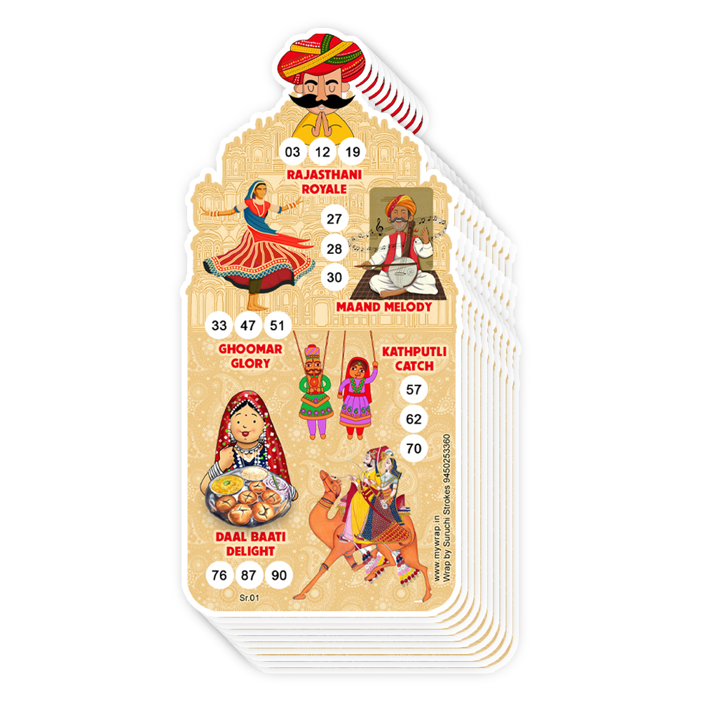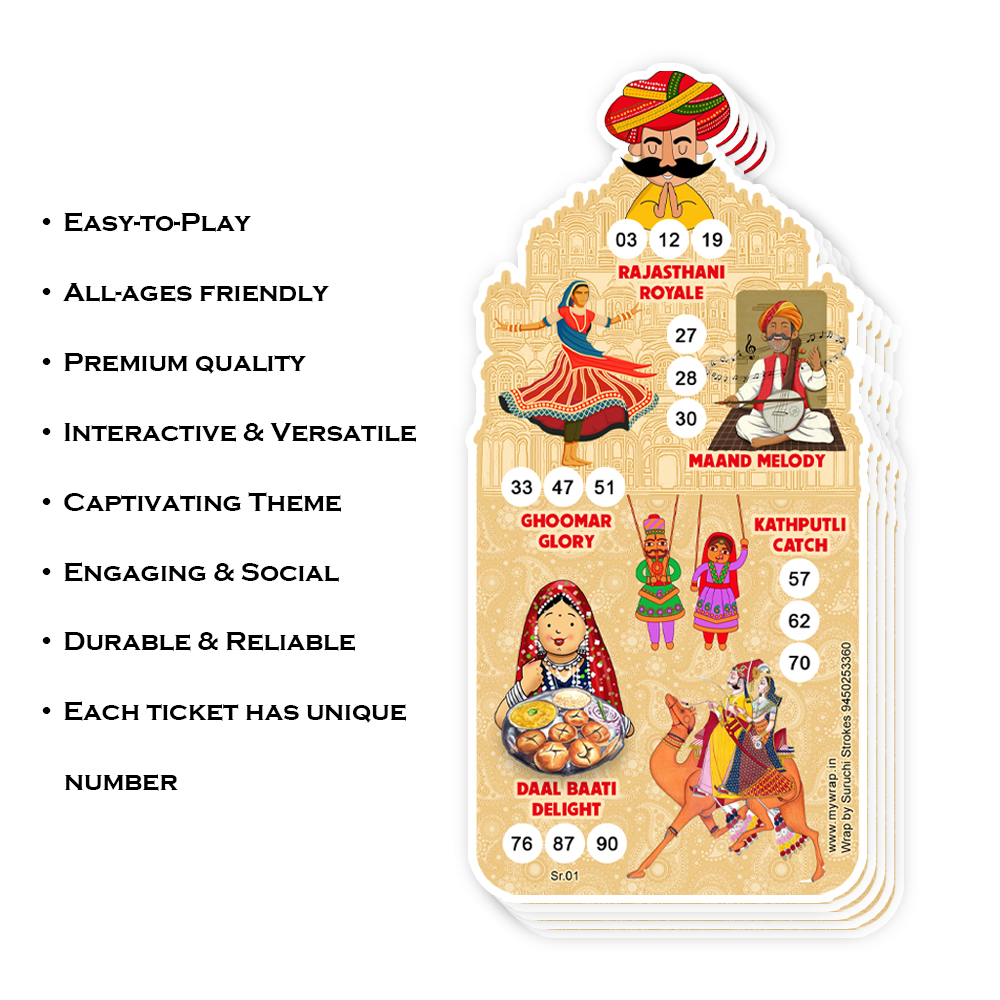 Wrap by “Suruchi Strokes® Presents a beautifully designed Rajasthani‐themed Tambola ticket.” This Theme tambola tickets Bring the lively spirit of Rajasthan into your game room with this specially-designed “Rajasthani Theme Tambola” game set. Crafted to entertain families, friends and party guests, this set blends the timeless fun of a tambola/bingo style game with rich Rajasthani flair and festive charm. The number grid is framed by ornate borders — echoing the carved Rajasthani royale, maand melody, daal baati delight and kathputli catch — giving every game card a regal feel. The background subtly features motifs drawn from “Mandana” wall-art and traditional folk designs, bringing a sense of heritage and home-grown artistry. Whether you’re organising a community event, a festive gathering, or a corporate celebration, this ticket adds a special charm. It’s not just about playing Tambola — it’s about experiencing a slice of Rajasthan. The design radiates warmth and vibrancy, appealing to guests of all ages, while bringing a refined, cultural edge to the classic game. The state of Rajasthan has a very rich, vibrant cultural identity — from folk dances (like the Ghoomar) to colourful costumes, to desert landscapes. Applying that theme to a game like Tambola adds visual interest, festive atmosphere, and novelty beyond the standard game. It helps make the game feel more event-worthy (e.g., for kitty parties, weddings, cultural nights) rather than just a simple number game. This tambola game is perfect for Kitty party, Rajasthani festival, get together, cultural event.