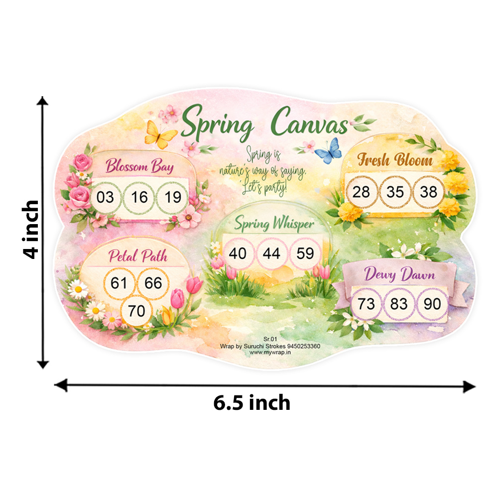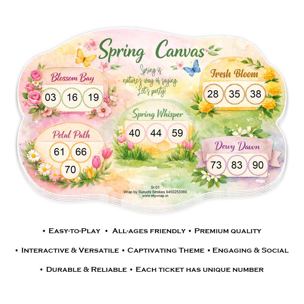 Wrap by Suruchi Strokes® Present Spring theme Tambola Tickets. Bring freshness and joy to your celebrations with this Spring Theme Tambola Ticket, specially designed to add colour, fun, and excitement to every gathering. The Spring Theme Tambola inspired by the beauty of spring blossom and summer vibes, this tambola ticket features a soothing pastel floral garden theme filled with blooming flowers, sunshine, and cheerful holiday energy. Perfect for creating a lively atmosphere, this tambola ticket is ideal for friend and family get-togethers, kitty parties, birthday parties, picnic outings, pool parties, beach holidays, and vacation celebrations. Enjoy the classic fun of housie with a refreshing twist as this spring summer tambola ticket turns every moment into a vibrant celebration.