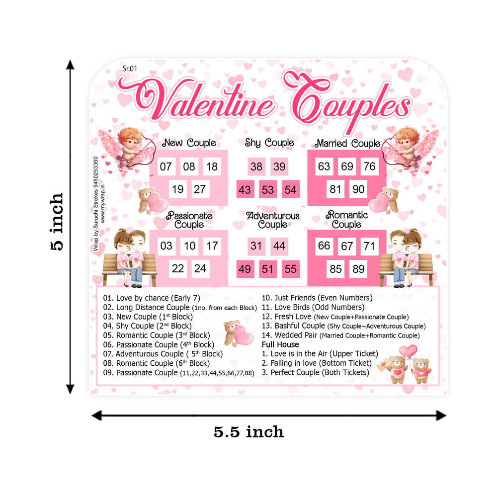 Suruchi Strokes® introducing the Valentine Tambola Ticket. Add a touch of romance and excitement to your Valentine’s Day celebrations with our Valentine Couple theme tickets. These good quality, vibrant, and gorgeous tickets feature a unique design, showcasing different types of couples as dividends, each representing a different aspect of love. Each ticket features with 30 numbers on each ticket, it’s the perfect game to bring fun and joy to your gathering. Offering a variety of designs to suit every taste, ensures you’ll feel the full essence of love surrounding you.
