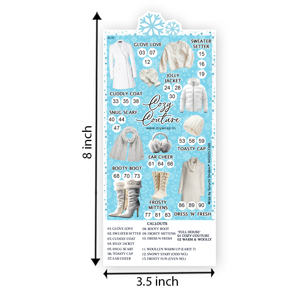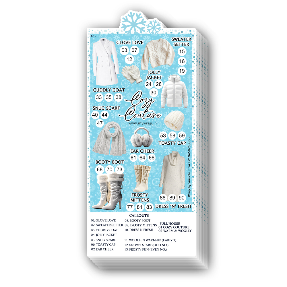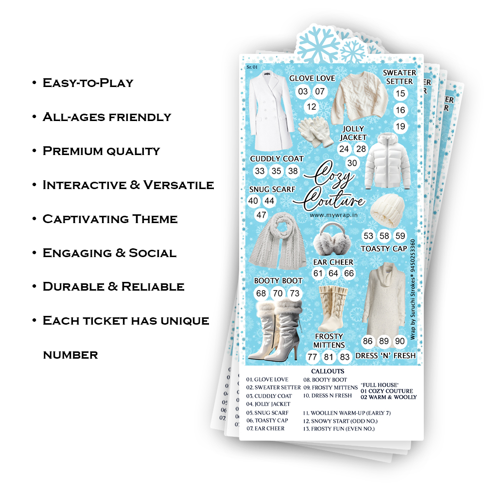 Wrap By Suruchi Strokes® Winter Collection Theme Tambola Ticket. Winter is the time to snuggle up, brew a hot drink, and laugh together with friends and family. What better way to bring everyone together than with a lively game of Tambola, decked out in a seasonal theme? Our “Welcome Winter” tickets are designed not just as a game accessory, but as a part of your décor and experience. These winter theme tambola tickets are incredible design to get enjoy and entertain this season, allowing you to preserve the memories long-lasting. This winter theme tambola is in unique cozy couture design and Enjoy your winter day with our beautiful tambola. This winter theme tambola is perfect for get together, kitty party, birthday, Christmas and always the age of people enjoy their winter holidays. For the winter edition the tickets/cards are decorated with winter motifs (sweater, winter glove, jolly jacket, toasty cap, booty boot etc) to give a seasonal feel. Cards printed on glossy/thick paper with winter graphics. Each ticket contains a unique set of numbers and is ready to use.